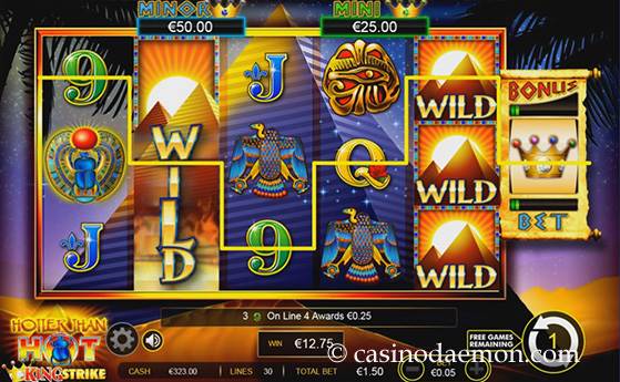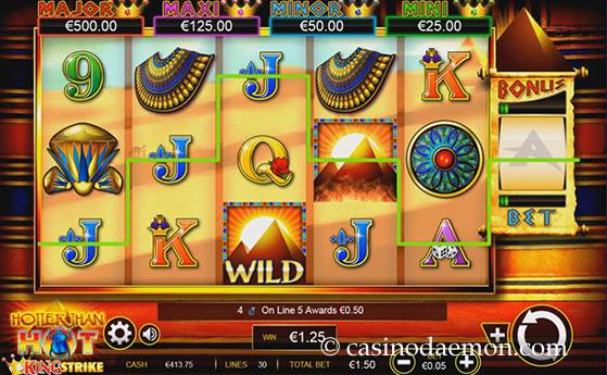Hotter than Hot from Ainsworth visits ancient Egypt and explores the treasures that you can find in the scorching desert sun. The symbols show artefacts of the old pharaohs, as well as the standard slot symbols. The music is also standard slot music that you would expect to find in a land-based casino. What makes this game special are the wild symbols, scatter wins, free spins and the King Strike bonus.