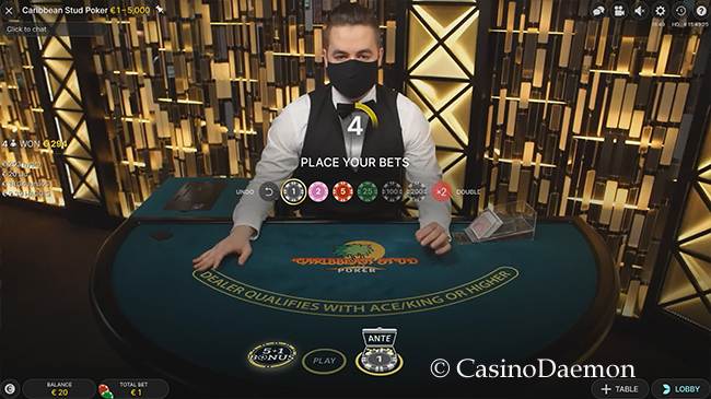 You can play Caribbean Stud Poker Live with bets starting from €1 up to €5,000. The game is played with one standard deck of 52 cards, which is shuffled after each round.