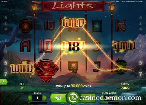 The slot game Lights by Net Entertainment is an exciting game with a pleasant atmosphere and soothing background music. The background image is an Asian landscape with mountains and lakes. The game gets its name from the shiny lantern symbols, that illuminate the night. In this game you get at least 2 wild symbols with each spin, and you can win up to 30 free spins. You can also win up to 90.000 coins with just a single spin.