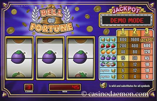 The Bell of Fortune slot has 3 reels with 1 pay-line. You can play either one, two or three coins per spin with a fixed coin value of 0.25 £/$/€. This means that one round with one coin cost 0.25 £/$/€, and playing all three coins will cost 0.75 £/$/€ per spin.